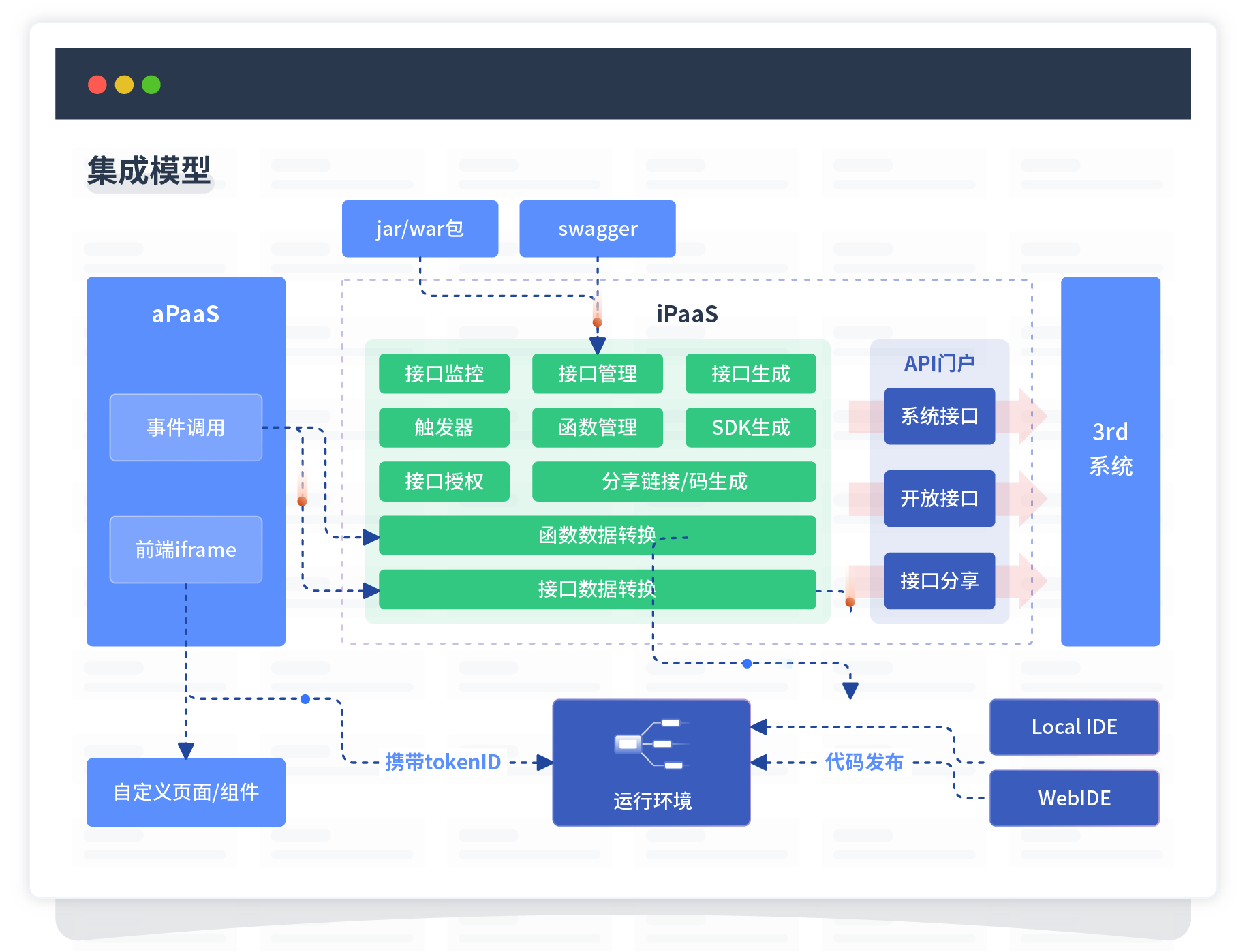 集成模型包括平台本身前 、后端能力的扩展 ,也支持通过API门户和第三方系统进行交互 。