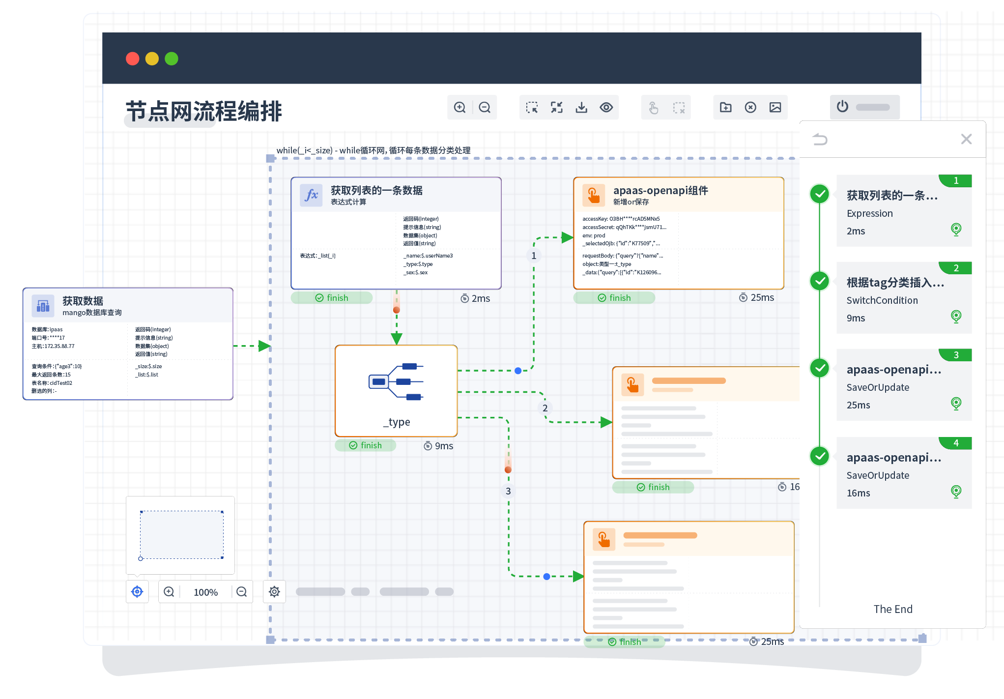 针对集成场景 ,组件定义后支持进行流程编制 ,不同于传统代码方式 ,通过图形化展示 ,支持在线调试 、日志查看和运行回放 。